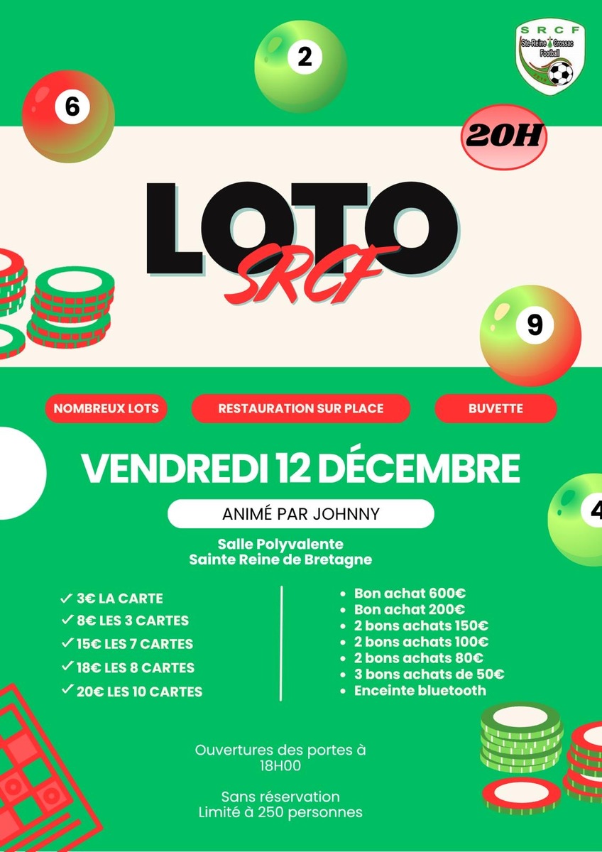 🚨 LOTO SRCF ! 🚨 🗓️ VENDREDI 12 DÉCEMBRE 📍 Salle Polyvalente, Sainte Reine de Bretagne 🚪 Ouverture : 18h00 | Début : 20h00 🎤 Animé par Johnny 💸 Gros lot : Bon d’achat de 600€ ! Plus pleins d’autres lots ! 🍟 Restauration et Buvette sur place. ⚠️ Places limitées à 250 personnes ! Premier arrivé, premier servi ! Venez tenter votre chance ! 💚