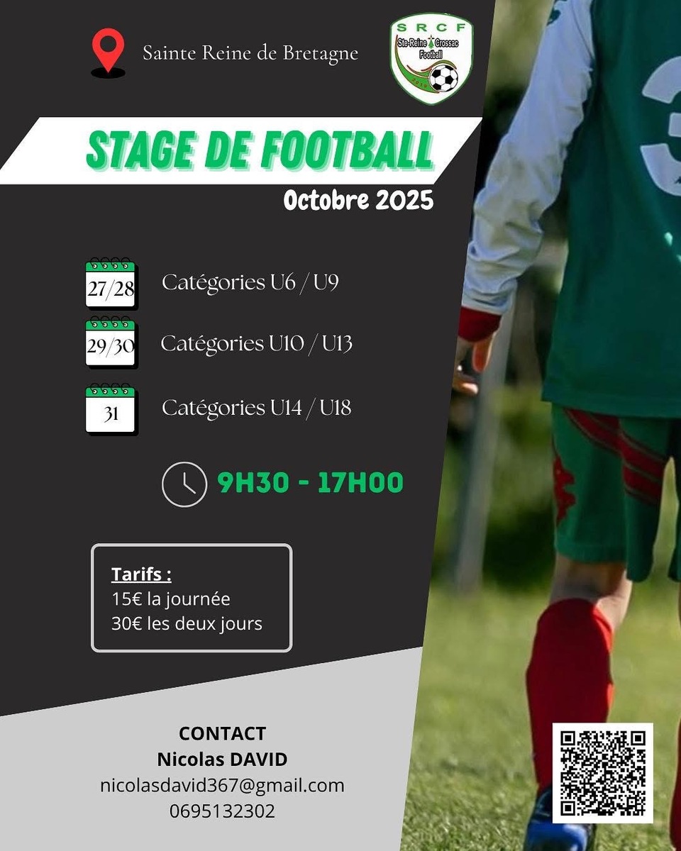 🚀 Les inscriptions sont ouvertes ! ⚽ Stages de football – vacances octobre 2025 📍 Sainte Reine de Bretagne - Stade Jean Perraud 📅 Du 27 au 31 octobre 🕘 9h30 à 17h00 Réserve ta place dès maintenant ✍️🟢🔴